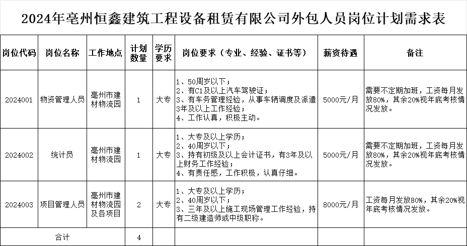 1、本次招聘崗位系2024年亳州恒鑫建筑工程設(shè)備租賃有限公司外包人員,錄用后與亳州市譙騰人力資源管理有限公司簽訂勞動(dòng)合同。辦理手續(xù)后安排到相應(yīng)的崗位工作地點(diǎn)。