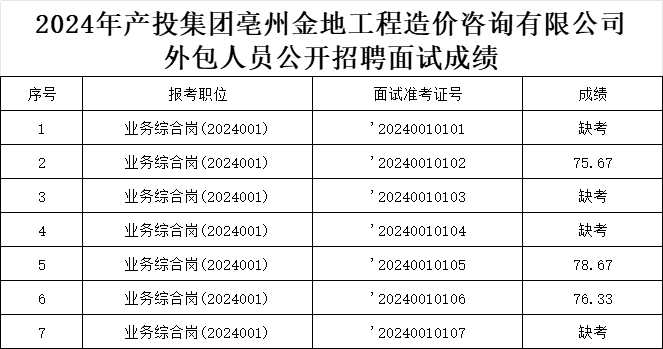 根據(jù)《2024年產(chǎn)投集團(tuán)亳州金地工程造價(jià)咨詢有限公司外包人員公開招聘》有關(guān)規(guī)定,現(xiàn)將面試成績予以公示。