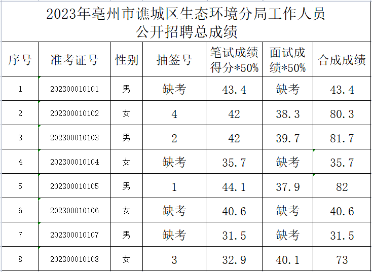 根據(jù)《2023年亳州市譙城區(qū)生態(tài)環(huán)境分局工作人員公開招聘》有關(guān)規(guī)定,現(xiàn)將總成績予以公示(詳見附表)。后續(xù)招考動態(tài),請報名考生持續(xù)關(guān)注公司公眾號查看,避免錯過相關(guān)信息。