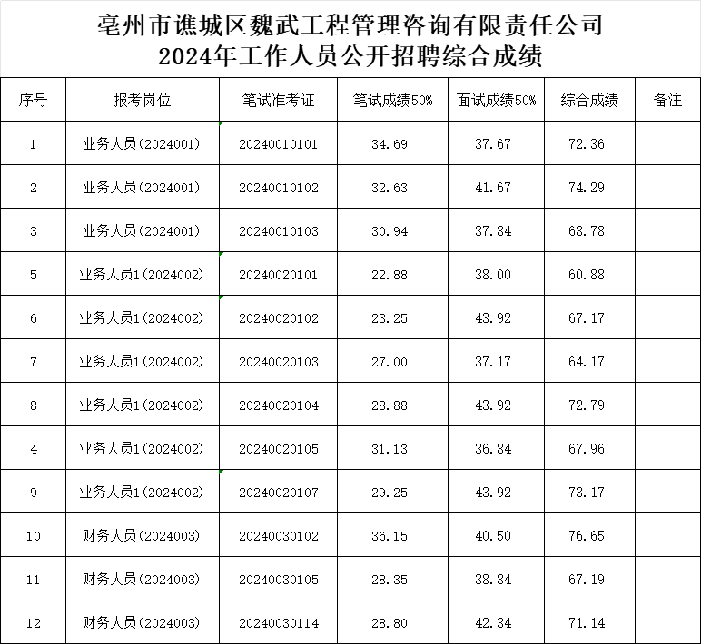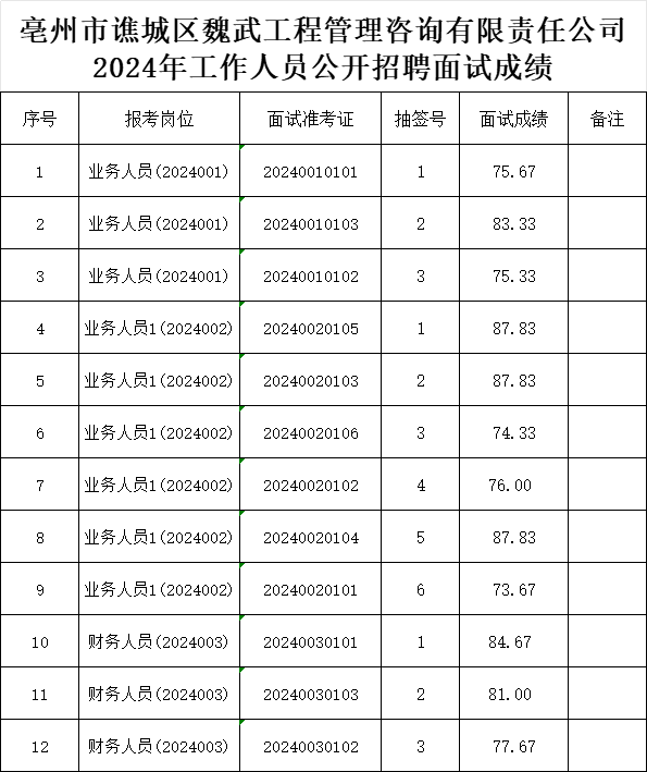 關于亳州市譙城區(qū)魏武工程管理咨詢有限責任公司2024年工作人員公開招聘面試成績及綜合成績的公示
