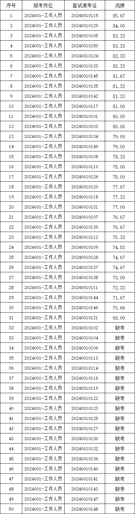 根據(jù)《2024年亳州市譙城區(qū)希望公益服務中心勞務派遣人員公開招聘》有關規(guī)定,現(xiàn)將面試成績予以公示。